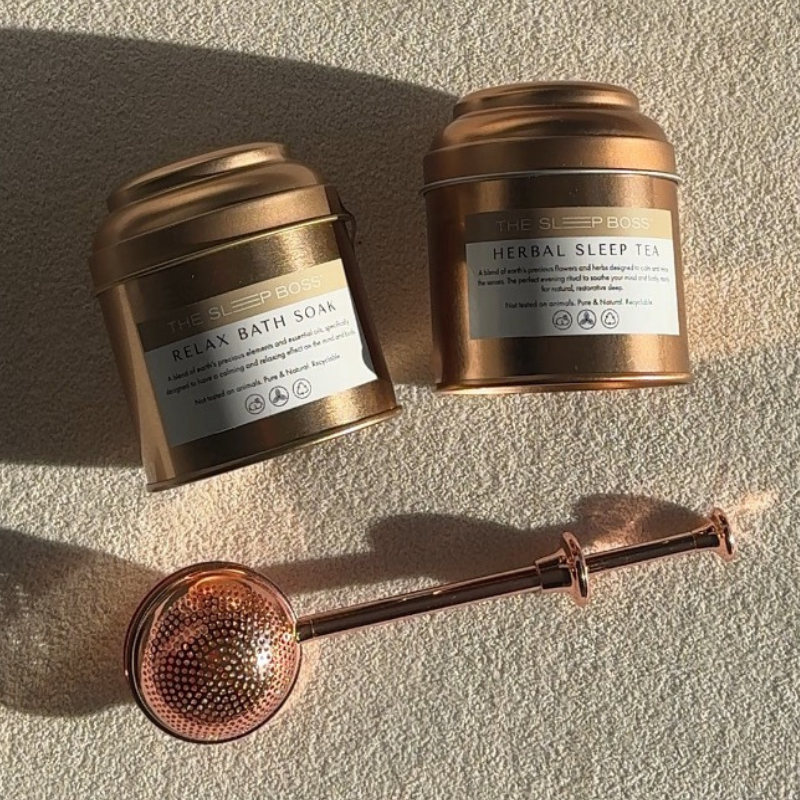 Herbal Sleep Tea: Organic lemon balm, organic chamomile, organic rose petals, organic lavender, organic vervain, organic passionflower.